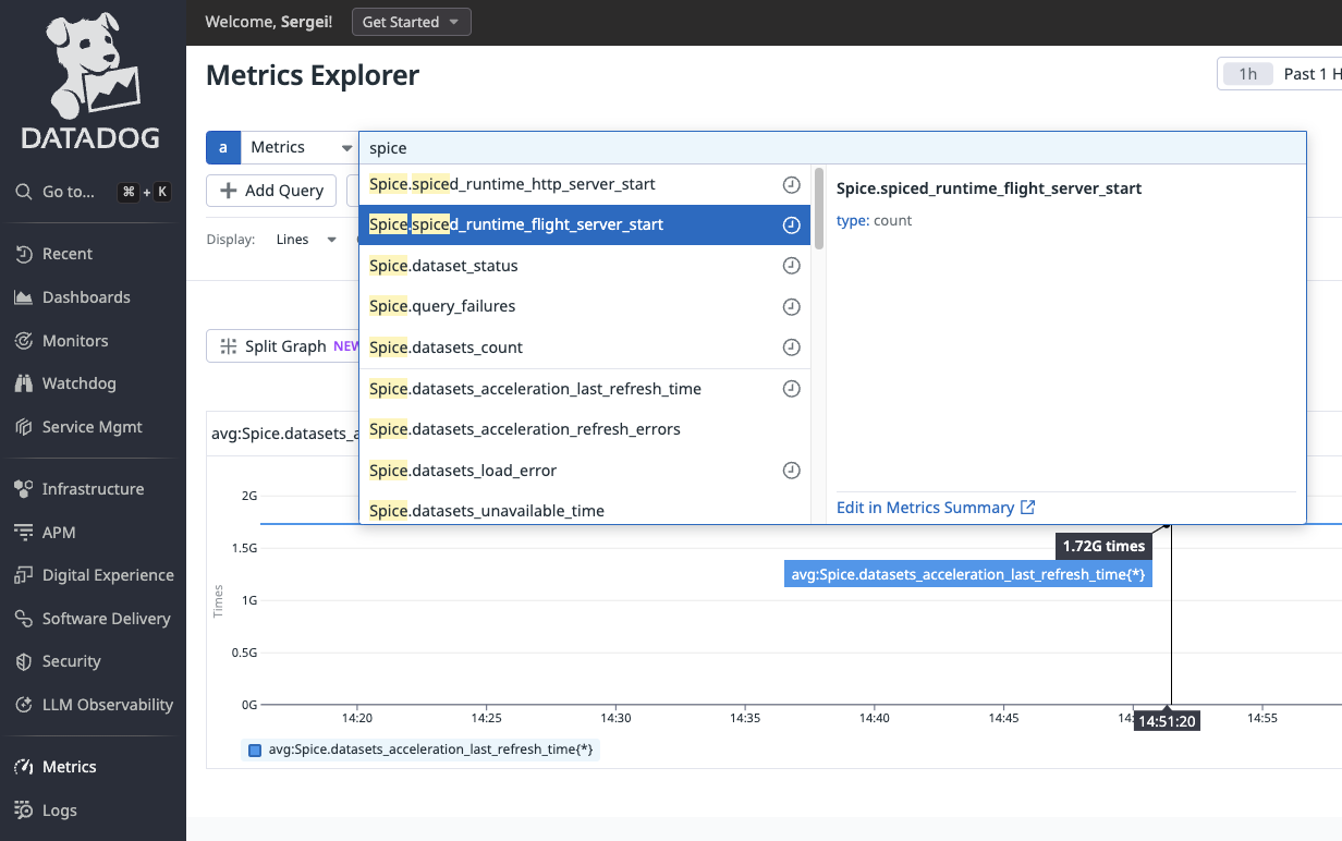 Spice can be monitored with Datadog using the Spice Metrics Endpoint and pre-built dashboards available in the Spice repository.